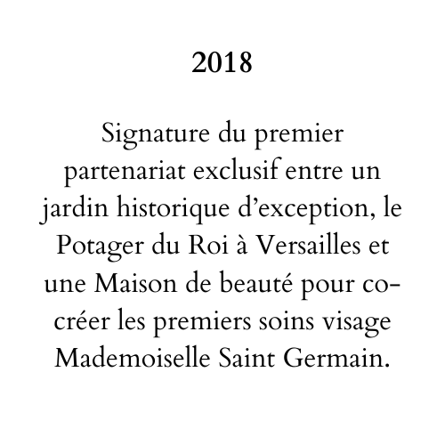 Each Mademoiselle Saint Germain product is an ode to these exceptional gardens, such as the King's Vegetable Garden at Versailles or the Renaissance gardens of Villandry. In these places where time seems to stand still, rare plants are cultivated with care, without chemical fertilizers or pesticides. These are gardens that have survived the centuries, adapting to change.
